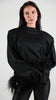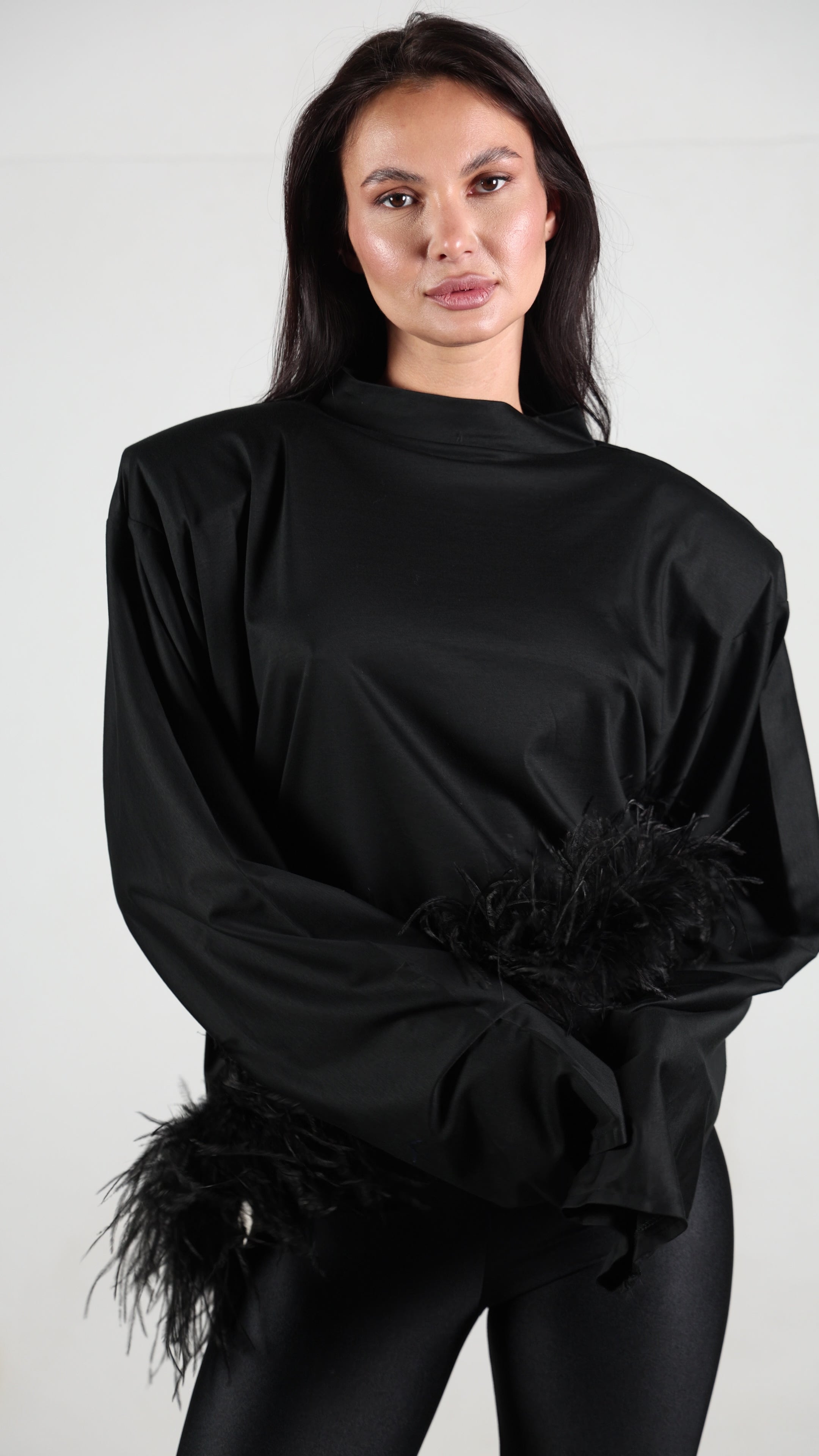 Le spalle imbottite strutturano la figura con carattere, mentre la manica lunga bilancia il design rendendolo sofisticato e versatile. Il dettaglio in piuma di struzzo (boa) removibile aggiunge un tocco glamour, permettendo di trasformare il capo da daily chic a statement piece.