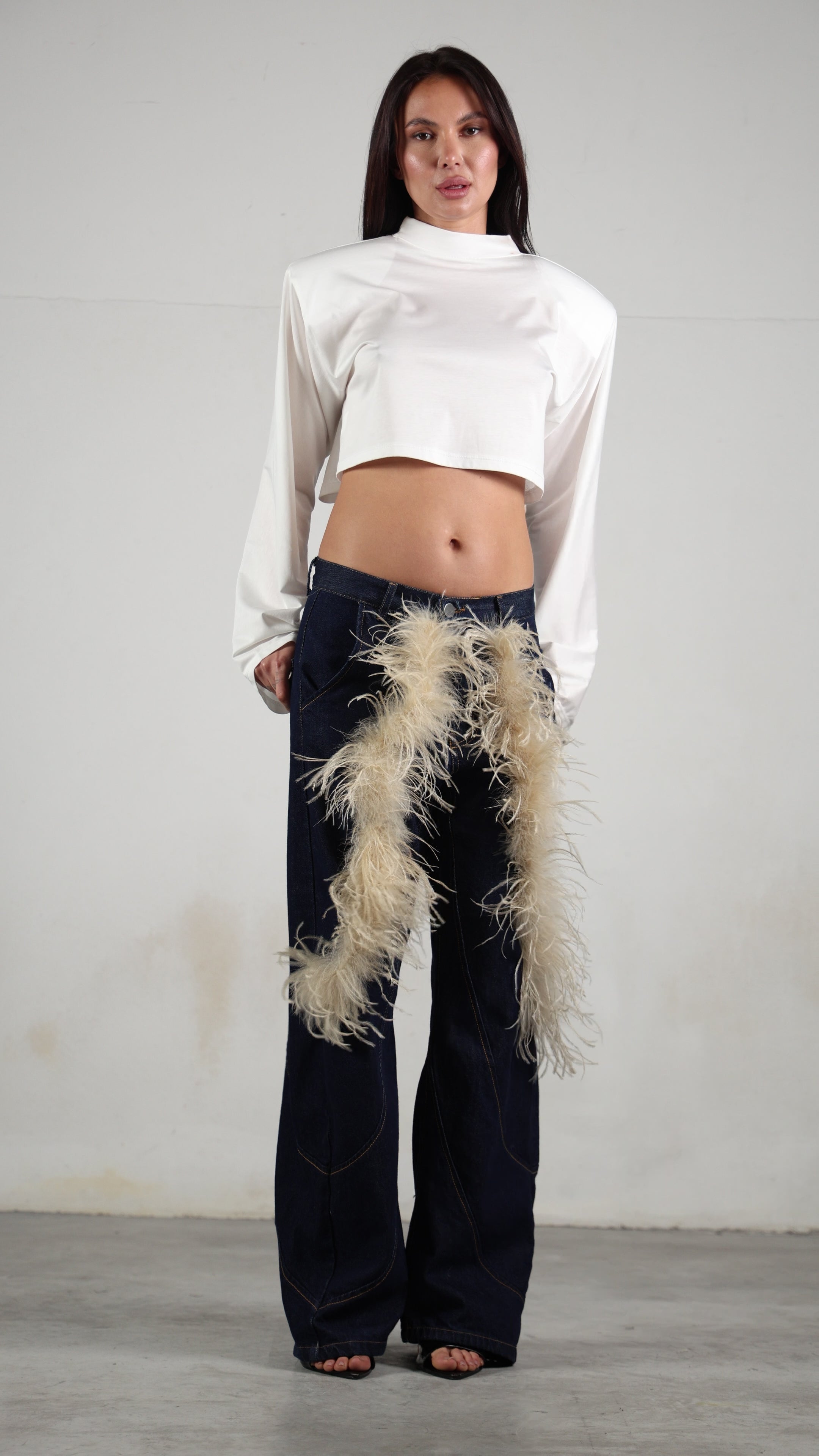 La linea over incontra il taglio corto creando un equilibrio contemporaneo, mentre le spalle imbottite strutturano la silhouette con carattere. La manica lunga completa il capo rendendolo versatile e perfetto per look sia casual che più ricercati.