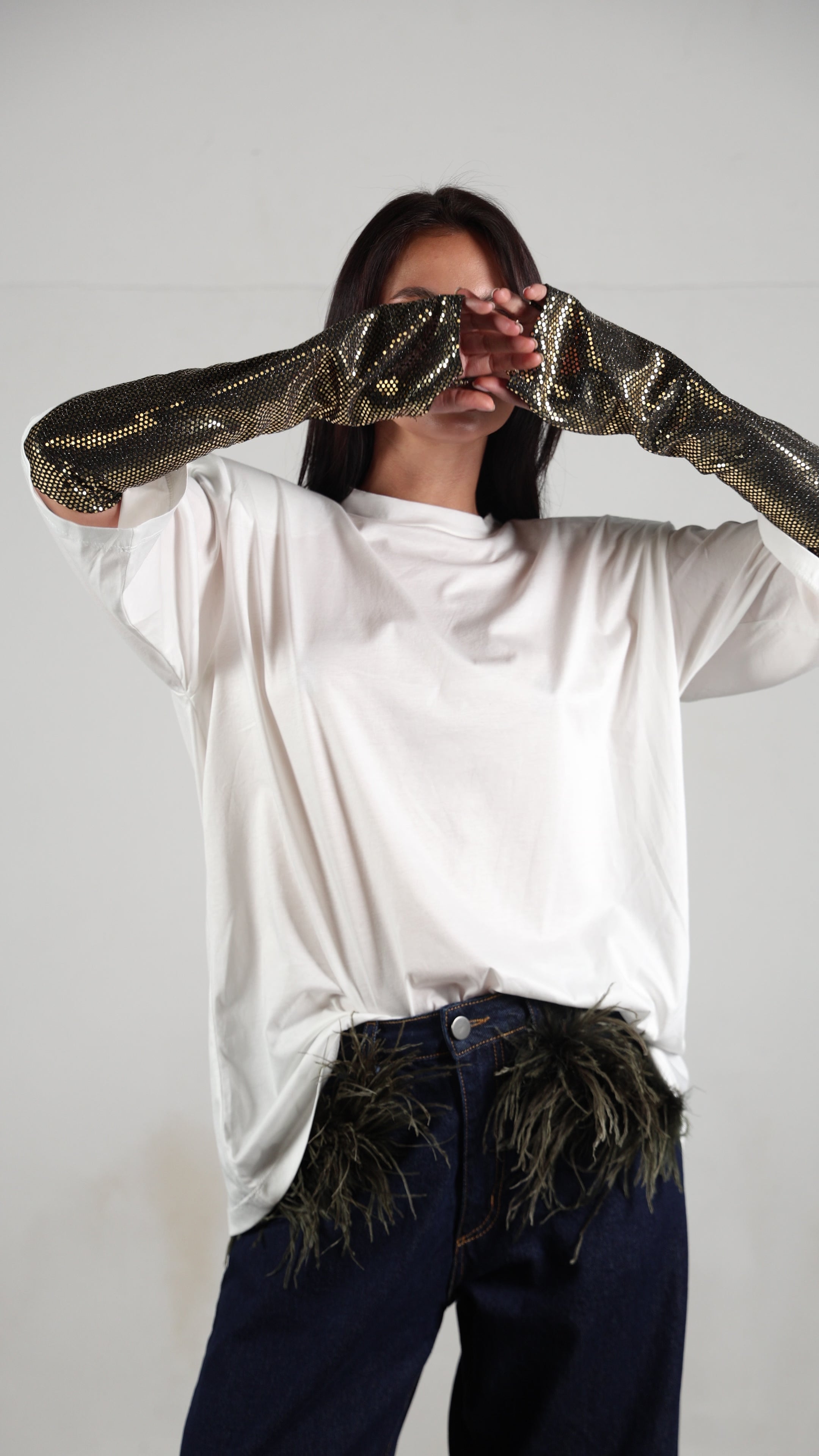 Le spalle imbottite strutturano la silhouette con carattere, mentre la manica a tre quarti dona equilibrio e raffinatezza al capo. La vestibilità over completa il modello con un’allure moderna e disinvolta, perfetta per look daily o più ricercati.